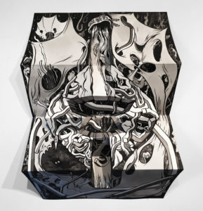 Burnham’s maximalist installation of folded, layered and intertwined drawings is like stepping into a pop-up comic book that’s as disorienting as it is exhilarating. Burnham is based in Maryland, where she is a tenured professor, and boasts a resume of exhibitions and collections across the country and beyond.