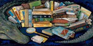 Christine Fifer’s paintings and sculptures revolve around books – their history & their contents – all woven together with puns, puzzles, and didactic intent to both amuse and encourage conversation. Still life paintings of precariously stacked first editions are simultaneously realistic and surreal, prompting extended investigation. Leaping from the canvas, Fifer’s sculptures utilize actual books suffering from wear or neglect that have been repurposed to create playful and thoughtful sculptures in search of their own Renaissance.