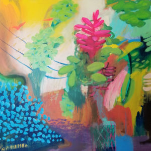 Caldwell’s mixed media paintings capture the exuberance of an island bursting with color: the endless shades of foliage, the magnificent variety of flowers, the aqua-teal-turquoise water, and the billowing sunsets shifting from peach-pink to the blue-purple-indigo of nightfall.