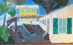 Garcia carries on the tradition of his teacher and mentor Mario Sanchez – colorful, shallow relief sculptures etched in wood – depicting his childhood in Key West.