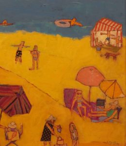 Sunbathers of all shapes and sizes laze in the sun or play in the ocean in Paige’s “Beach Day” series, marking a departure from her previous abstract paintings. Bright, lively and charming, the work is quintessentially tropical but never kitschy.